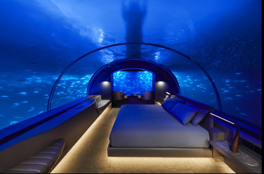While you sleep, tropical fish, manta rays, and reef sharks drift quietly above your bed—creating an experience that feels more like living inside a marine documentary than staying in a hotel.